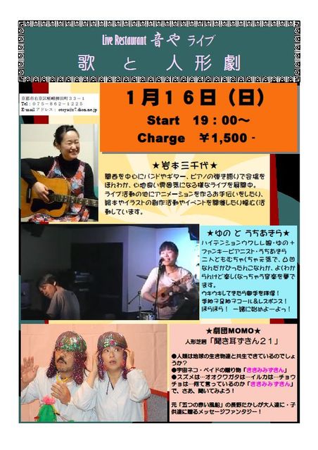 スタート19:00 チャージ@1500 出演: 岩本三千代 ゆのとウチアキラ ★劇団MOMO ●「SF聞き耳ずきん21」 人類は地球の生き物達と共生できているのでしょうか? 宇宙ネコ・ベイドの贈り物…「ききみみずきん」 スズメは…オオクワガタは…イルカは…チョウチョは…何て言っているのか「ききみみずきん」でさあ、で聞いてみよう! ライブレストラン「音や」 〒616−8363 京都市右京区嵯峨柳田町33−1 電話&FAX:075−862−1225 E-mail アドレス: otoya@r7.dion.ne.jp 地図 http://otoyalive.web.f