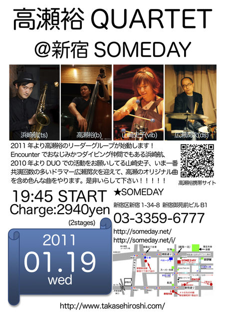2011年1月19日 新宿 SOMEDAY 高瀬裕(b)Quartet,浜崎航(ts),山崎史子(vib),広瀬潤次(ds) 03-3359-6777/charge:2940yen/19:45〜2stages 新宿区新宿1-34-8 新宿御苑前ビルB1 http://someday.net/ http://someday.net/i/ 来年早々にやりま〜す! オリジナルとアリモノ曲、半々くらいかなぁ。 皆様、ヨロシクお願いいたします!