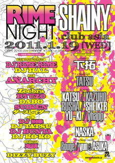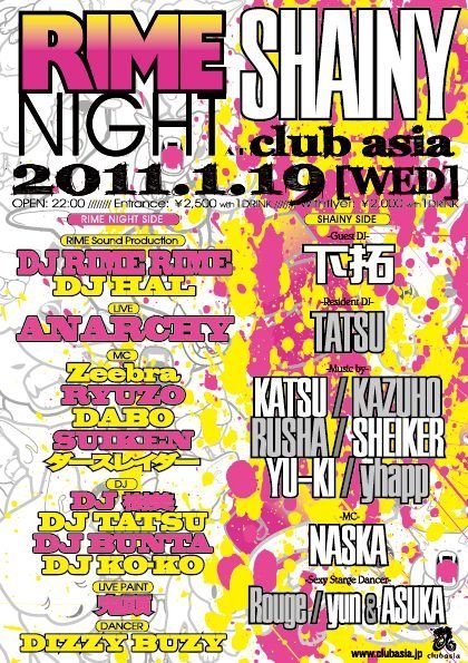 管理人様告知失礼致します!! 1/19(水)のasiaではVUENOSにおいて平日大人気なパーティ、『RIME NIGHT』と『SHAINY』が夢のコラボレーションRIME Sound Production(DJ RIMERIME/DJ HAL)を筆頭に超豪華キャスティング LIVE SHOWCASEにはANARCHYが登場、豪華MC陣に華やかなステージダンサーとともにDJ RIMERIMEやDJ HALがフロアに良質な音楽を届け、終始このパーティーを盛り上げます 皆様にとって忘れられない一夜になるでしょう ※VUENOSではなくasiaでの開催になります!! ※ゲストご希望の