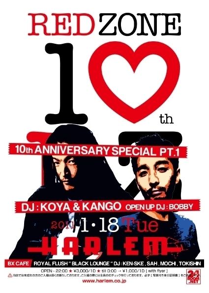 管理人様、告知失礼します!! 1.18(火) RED ZONE&ROYAL FLUSH 10周年@渋谷HARLEM & BX CAFE ■22:00 OPEN ■MENS:3000YEN/2D ■LADIES:2000 YEN/2D ■Till24:00¥1,000/1D(w/f) ■Resident DJ`S■ DJ KOYA DJ KANGO 【ROYAL FLUSH】 DJ KEN-SKE __________________________________________________ ■第3週■ ★OPEN UP DJ`S★ BOBBY BANJO HACCHI KURO ★BxCafe DJ`S★ 【BLACK LOUNGE】 SAH http://mixi.jp/view_community.pl?id=2818925 MOCHI TOKISHIN ____________________________