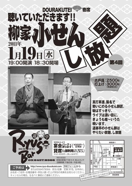 道楽亭寄席 柳家小せん「し放題」 vol.4 ●2010年1月19日(水) ●19:00開演(18:30開場) ●出 演 柳家小せん[前半は落語、後半は歌] ●木戸銭 2500円 ●打 上 3000円(希望者のみ) ●定 員 50名 (満席になり次第締め切らせていただきます) ご予約・お問い合わせはメール・お電話で 道楽亭 佐藤まで。 dourakutei@kph.biglobe.ne.jp TEL/FAX 03-6457-8366 ギターを持った噺家 鈴々舎わか馬改め柳家小せん 落語と歌のオンステージ。 はたして2011年バージョンに変化はあるのか