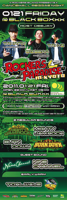 毎回大盛況のROCKERS PARADISE2011年一発目は京都BLACK BOXxxで開催!! 今回は地元からGUEST SOUNDにNINE CHANNEL!! HOST DEEJAYにTAKAFIN from MIGHTY JAMROCK , BIG BEAR from SCORPION . TAK-Zを迎えて危ない夜になる事間違いなし!! もちろんREGULAR SOUND MIGHTY JAMROCK, BURN DOWN, TIDAL WAVEも見逃せません!! ROCKERS PARADISE WEST IN 京都 1/21(金) @BLACK BOXxx <HOST DEEJAY> TAKAFIN from MIGHTY JAMROCK BIG BEAR from SCORPION TAK-Z <2REGULAR SOUND> MIGHTY JAMROCK BURN DOWN
