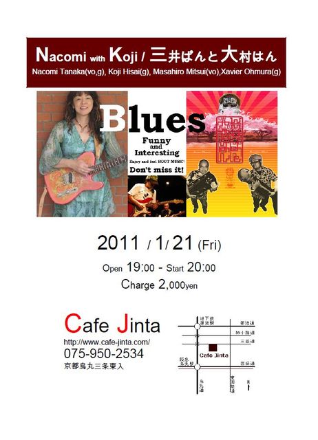 出身の京都でしかも 懐かしい仲間とライブ!って 超うれしい みんなの出身バンドを かいたら タイトルみたいになった。(笑) 1月21日(金) Cafe JINTA http://www.cafe-jinta.com/ 京都府京都市中京区烏丸三条東入 梅忠町20-1 烏丸アネックス2F tel/fax 075-950-2534 Nacomi & 久井コージ 三井ぱんと大村はん 20:00 / 2000円