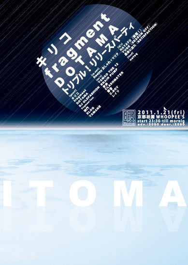 ≪暇-itoma-≫ meets “キリコ/fragment/DOTAMA トリプル!!!リリースパーティ” 2011.1.21(金) @京都祇園WHOOPEE'S SART 23:30〜till morning ADV.\2000 DOOR.\2500 今回の【暇-itoma-】は、 今巷で噂の『術ノ穴』レーベルの首謀者Fragmentをはじめ、 レーベル色を象徴する初期からの看板アーティスト!辛辣にDISりまくるキリコ、 最近のバトルでの快進撃っぷりやTV出演などから目が離せないDOTAMAの 3アーティストが同時にそろってのトリプルリリースパーティーが実現!! 何といっても、キリコ3rd後の関西で
