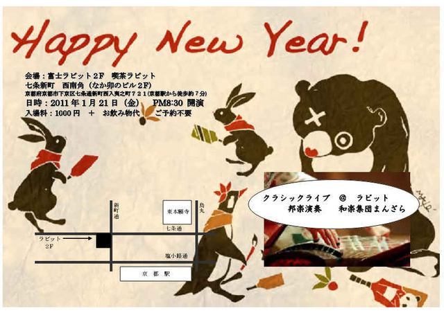 クラシックコンサート@ラビット ☆2011年、まんざら初コンサート ・料金 1000円+お飲み物代 「喫茶ラビット」場所→七条新町 西南角(なか卯のビルの2階) 下京区七条通新町西入夷之町721(京都駅から徒歩7分) ◎曲目 三段の調べ/久本玄智 箏と三絃のための嬉遊曲/船川利夫 春の海/宮城道雄 萌春/長沢勝俊 町へ/ジョン・海山・ネプチューン 是非お越し下さい!