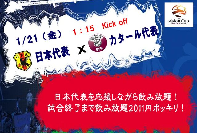 遂に 決勝トーナメント突入!! 熱くなること間違いなし!! 2011/1/21(金)1:15キックオフ!! 日本VSカタール みんなで日本を応援しながら飲み放題!! 試合終了まで飲み放題2011円ポッキリ!! 注:ご予約いただいた順にお席を埋めていきますので ご希望の席ございましたらお早めにご予約お願いします。 満席の場合立っての観戦になりますのでご了承ください。
