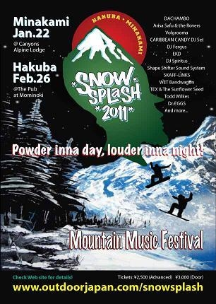 2011年1月22日(sat) GUNMA-MINAKAMI @ CANYONS 「SNOWSPLASH 2011」 Open/DJs Start: 18:30 / Start: 20:00 チケット:前売 ¥2,500 / 当日 ¥3,000 問合せ:CANYONS 0278-72-2811 / http://www.canyons.jp/ 「Main Stage」 SHAPESHIFTER (NZ) SKAFF-LINKS ARISA SAFU & THE ROVERS & more TBA... CARIBBEAN DANDY DJ Set: 藤井悟 aka SATOL.F (HEAD CASE) TETZ MATSUOKA (CLUB SKA) KAZ SUDO (THE ZOOT 16) AMEMIYA KSK (CARIBBEAN DANDY) SAUDI (未来世紀メキシコ) TXAKO (JAPONICUS) DOC.KOYAMANTADO (FZMX) TZ (CHANKA B