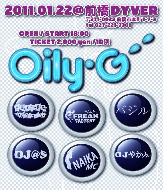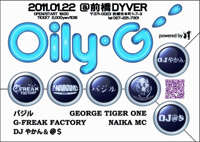 拭っても拭いきれない暑苦しさ 纏わり付いたらそう簡単には離れられない イベント『OILY-G』2011年1月より始動します 暴れる必要なんかないです。ただそこに居るだけで、自然と体が動き出す。血液の温度が上がる。そんな熱を込めつつも、それぞれの楽しみ方で遊んで行って下さい。 【 Oily・G 】 Powered by G-Pun 2011.1.22 sat @Maebashi DYVER http://www.dyver.jp/ 〔ACT〕 G-FREAK FACTORY http://www.g-freakfactory.com/ GEORGE TIGER ONE http://ameblo.jp/georgetigerone NAIKA MC http://naika-mc.com バジル
