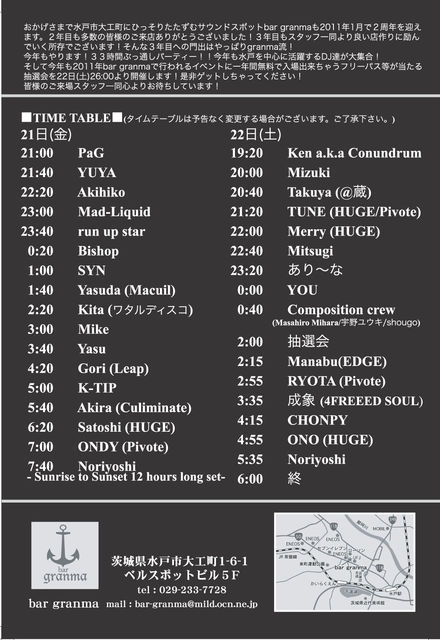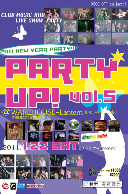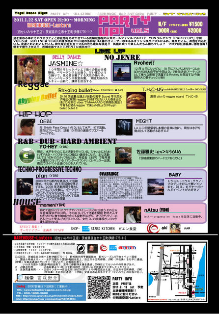 会を重ねる事にそのクオリティと存在感をあげてきている茨城北部発の人気オールジャンルPARTY YDNプレゼンツ「PARTY UP!」今回VOL.5は 2011NEW YEARの踊り初め!!13組の多彩なDJ陣パフォーマーのエネルギッシュなバイブスにふれ、踊りたい人、お酒をのみたい人、友達とわいわいしたい