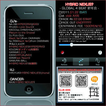 ★2011/1/22 Sat HYBRID NEXUS?新年会 @club AXIS 【HYBRID NEXUS?】 ‐GLOBAL 4 BEAT 新年会‐ ◇FADE IN 22:00 START ◇FADE OUT END?????? ◇ENTRANCE FEE 1500YEN 1Drink付き ◇ at club AXIS -GLOBAL 4 BEAT- HYBRID NEXUS?より2011新年のご挨拶!! 2011年、第1弾ハイブリッドネクサス的新年会 当日、お年玉?福袋??特典で、先着10名様にHYBRID NEXUS?ロゴ入りエコバック進呈!!さらに来場者にはHYBRID NEXUS?2011オリジナルステッカー(枚数限定先