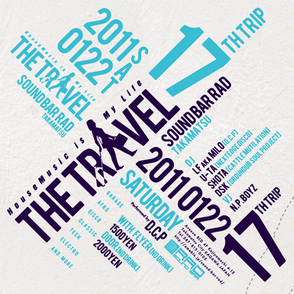 奇数月のレギュラーハウスパーティ【THE TRAVEL】 2011年第一回目は久々のオリジナルメンバーのみで開催です! 今回よりチケット制を廃止、フライヤー持参もしくは フライヤー画像提示で1500円(ドリンクチケット500円要購入)で 入場していただけます。 また、おなじみMIX CDシリーズ【TTM】もリリース! 今回はDJ SHOTAによる、しっとりと落ち着いたグルーヴのDEEP HOUSEMIX。 数量限定なのでお早めに!! 今年も【THE TRAVEL】をよろしくお願いします。 THE TRAVEL -17TH TRIP- 2011.1.22 SAT 22:00 START at SOUND BAR RAD
