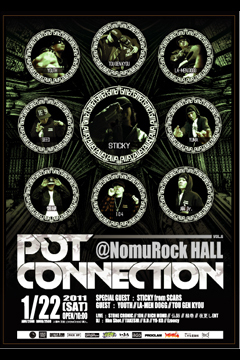 2011年一発目!!!!!!! 今年も奇数月第4土曜@NomuRock HALLにて「POT CONNECTION」開催! 2011.01.22(sat) 「POT CONNECTION vol.6」 @NomuRock HALL(香川県高松市瓦町2-6-14 高松アミュージアムビルB1F/087-813-0069) OPEN/22:00 (ADV) 2000YEN (DOOR) 2500YEN 共に、入場時別途1DRINK(\500)購入。 <<SPECIAL GUEST>> STICKY (from SCARS) <<GUEST>> YOUTH (from KARASS CASTLE) LA-MEN DOGG (from KARASS CASTLE) TOU GEN KYOU (FEIDA-WAN + DJ VALLY /from FLY DAY) <LIV
