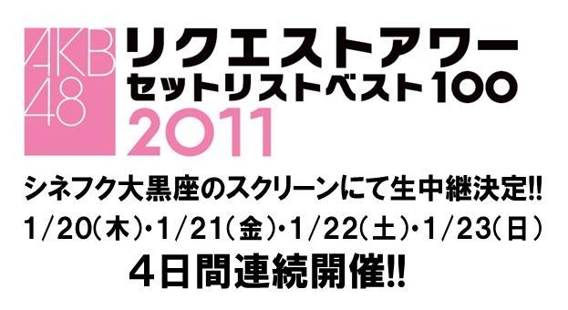 【シネフク】 「AKB48 リクエストアワー セットリストベスト100 2011」 大黒座スクリーンにて生中継決定!! NEW 詳しくはHP参照してください http://www.furec.jp/cinema_topics/topics.php?id=306 人気アイドルグループ「AKB48」(エーケービー フォーティエイト)が、1月20日(木)〜23日(日)の4日間、「SHIBUYA-AX」(東京都)で開催するコンサート「AKB48 リクエストアワー セットリストベスト1002011」の模様を、シネフク大黒座のスクリーンにて、同時生中継で上映いたします。 【生中継!AKB48 リクエストアワー セッ