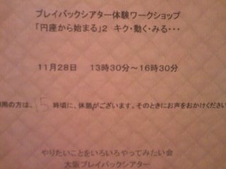 みなさま。 今年も残り少なくなり、皆さまにとってどんな年だったでしょうか。 私は出会いあり、別れありだったな〜と思い出します。 残り少ない2010年を味わいながら、2011年を迎えようと思います。 さて、新年1月の案内です。 前回のワークで、体調が万全でないにも関わらず、 時間と共に、不調さを忘れて動く姿を、多く見ました。 初めての人は、まさか劇なんて・・・ そんな言葉が印象的でしたが、 その方を含めて皆さん、素晴らしい演者でした。 1月にも、円座から始まり、プレイバックシアターをします。 新年