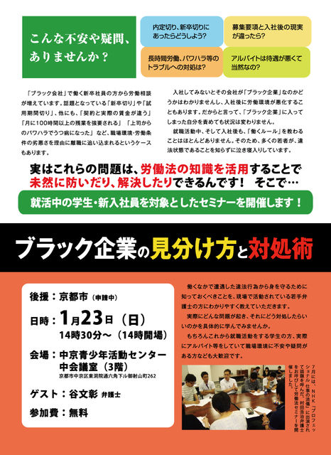1月23日(日)、「若者のキャリアを守ろうキャンペーン 〜ブラック企業の見分け方と対処術〜」というテーマで、労働法セミナーを開催します。 講師は、昨年12月14日に京都地裁にて和解解決しました、「ウェザーニューズ過労自殺事件」に携わった若手弁護士である、谷文彰弁護士をお招きします。 ※ウェザーニューズ裁判について(http://www.daiichi.gr.jp/publication/johobox/2010/122.html) 「内定切り・新卒切りにあったらどうしよう!?」 「募集要項と、入社後の現実が違かったら?」 「長時間労働・パワハラ等のトラブルへの対処