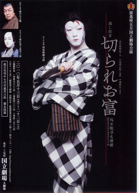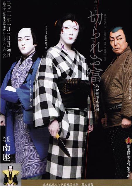 きものde南座 「前進座新春公演」 演目 通し狂言「切られお富」 1月23日 この日は千秋楽・・しかも全館貸し切り! 主催は全国組織の「NPO法人きものを着る習慣をつくる協議会」160支部 当日、きもの姿の方は割引がございます! 2011年 1月23日(日) 開場 10:30 イベント開始 11:00 開演 11:30〈予定〉 前進座歌舞伎の傑作、二十五年ぶりに待望の上演! 春日八郎のヒット作「お富さん」でも知られた「切られ与三郎」の書き替え狂言。 その切られる人物の与三郎をお富に置きかえた『切られお富―処女翫浮