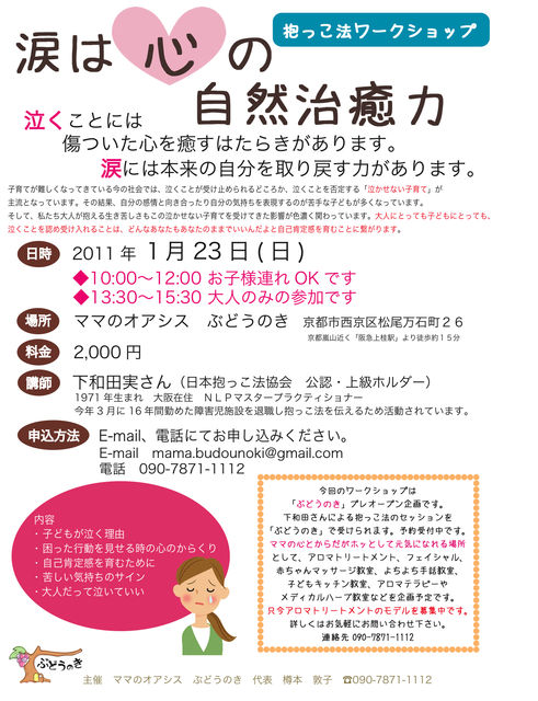 管理人様、貴重なスペースをお借り致します。 抱っこ法ワークショップのお知らせです。 「涙は心の自然治癒力」 泣くことには 傷ついた心を癒すはたらきがあります。 涙には 本来の自分を取り戻す力があります。 子育てが難しくなってきている今の社会では、泣くことが受け止められるどころか、泣くことを否定する「泣かせない子育て」が主流となっています。その結果、自分の感情と向き合ったり自分の気持ちを表現するのが苦手な子どもが多くなっています。そして、私たち大人が抱える生き苦しさもこの泣かせない子育てを受け