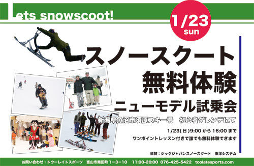 イベント告示です。 1月23日新潟県魚沼市須原スキー場にて ニューボード・ニュースクート試乗会あります 初心者も無料レッスンありますので 長靴で大丈夫です是非この機会にスノースクート試してみては! 主催 TOOLATE 小出IC降りて30分来てくださいね 皆さん一緒にすべりましょ!