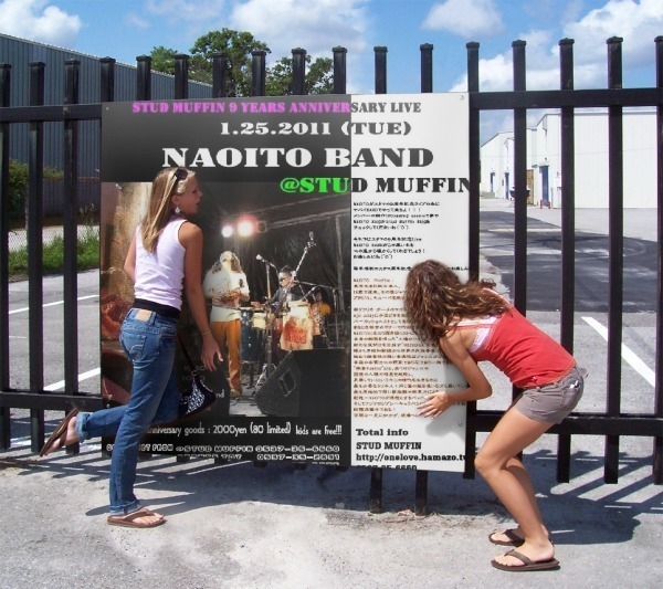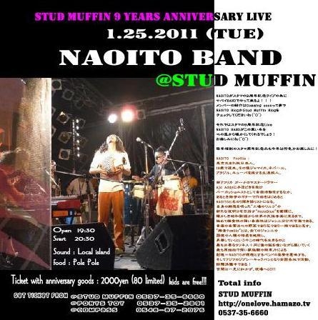 明けましておめでとうございます 管理人様失礼致します お陰様で我がSTUD MUFFINは今月1月22日で9周年を迎えます。 そしてそのビックエベントとして2011.1.25(TUE)に 9周年記念ライブと題し NAOITO BANDが お祝いしに来てくれる運びとなりました。 Open 19:30 Start 20:30 9周年記念品+チケット 2000円 Sound Local Island Food Pole Pole Ticket取扱店 Stud Muffin 0537-35-6660 Pony's Toy 0537-35-2891 Compass 0548-87-2076 是非参加してみてくださいねぇ〜 もし