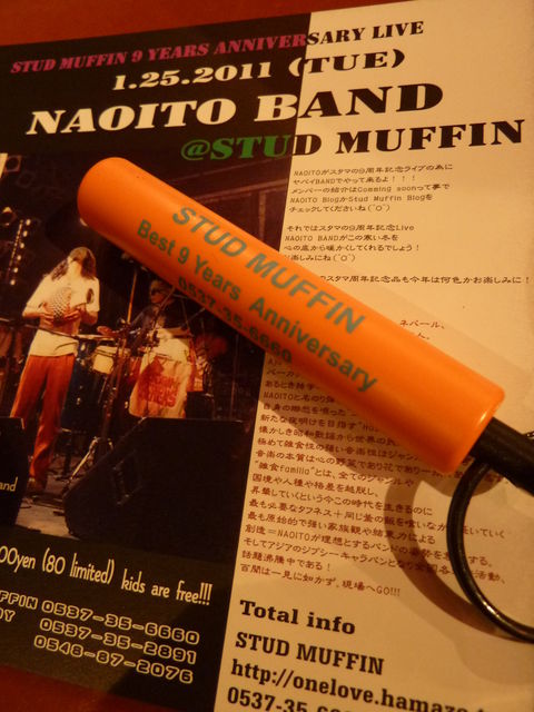 お陰様で我がSTUD MUFFINは今月1月22日で9周年を迎えます。 そしてそのビックエベントとして2011.1.25(TUE)に 9周年記念ライブと題し NAOITO BAND(Rickie-GのBack Band)が お祝いしに来てくれる運びとなりました。 Open 19:30 Start 20:30 9周年記念品+チケット 2000円 Sound Local Island Food Pole Pole Ticket取扱店 Stud Muffin 0537-35-6660 Pony's Toy 0537-35-2891 Compass 0548-87-2076 是非参加してみてくださいねぇ〜 もし欲しければ9周年記念キーホルダーもあるよ(^−^)1