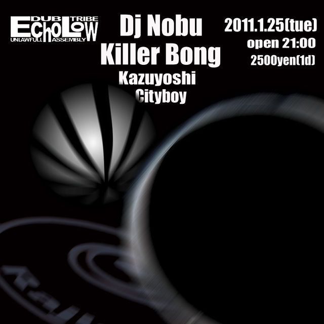 New Mix "ON" も発売され、聴く者を混沌と陶酔の坩堝(るつぼ)に導き続けるDJ NOBU とRajishan登場を最も待ち望まれたKILLER BONG Dub Tribe Unlawfull Assembly "Echo Low" 2011.1.25(tue) place : Rajishan open : 9pm charge : 2500yen(1d) Guest : DJ Nobu , Killer Bong DJ's : Kazuyoshi , Cityboy info : Rajishan 090-3388-2290 静岡市葵区両替町2-7-11SKTビル1F