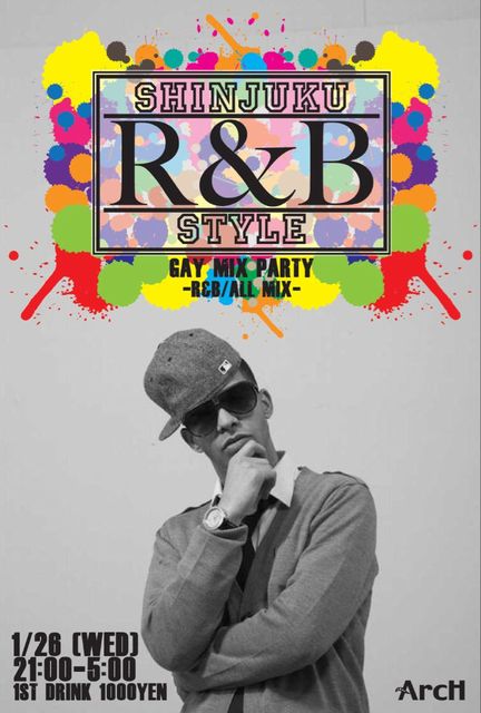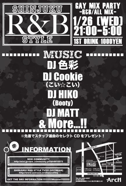 【SHINJUKU R&B STYLE】@CLUB ArcH GAY MIX PARTY -R&B/ALL MIX- 1/26(WED) OPEN 21:00 ★FEE 1ST DRINK ¥1000 (ENTRANCE FREE) ★MUSIC 色彩 Cookie (こい☆こい) HIKO (BOOTY) MATT DRANK ★TEQUILA BOY KOTA 平日の夜に良質なR&Bを! というテーマの元に開催してきたSRS! なんと今回からオールナイト開催へとバージョンアップ!! 新年を迎え、SRSも新たな気持ちで再スタートを切ります! 今年も最終水曜日はSHINJUKU R&B STYLE!! ※先着でスタッフ選曲のセレクトCDをプレゼント! 【mixiコミュ