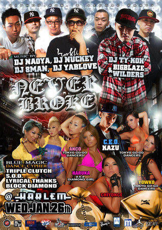 1/26(wen) NEVER BROKE SPECIAL @ CLUB HARLEM HOST BY C.E.O.KAZU SP GUEST STATIC SELEKTAH & TERMANOLOGY GUEST DJ MASTERKEY GUEST LIVE SIMON DJ.TY-KOH.NAOYA.8MAN.NUCKEY.YABLOVE. SOUND.BIGBLAZE WILDERS DANCE CYPHER 努 TRIPLE CLUTCH S.O.D BLOCK DIAMOND GOGO DANCERS ANCO HARUKA YOWKO MIE メッセージいただければゲストご用意できます。 入口でダックのゲストでミクシーと言えば、男性は2000円1D、女性は1500円1Dで入場できます!!