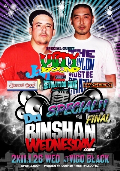 マイミクのみなさん、 先週のLEGALIZE IT、ありがとうございました! 今日はBINSHAN WEDNESDAY FINAL!! これでREVOLUTION GANGのVIGOでの ダンスは最後です。 今日はパーーーーーっと行きたいんで、 皆さん宜しくお願いします GUESTは横浜からUNITY SOUND!! まちがいないっす!! BINSHAN WEDNESDAY ~VIGO BLACK FINAL SPECIAL~ 1/26(水) @VIGO BLACK 静岡市葵区両替町2-4-9 日映森岡ビル3F TEL/FAX 054-255-3845 www.vigoblack.com OPEN 23:00~ LADIES \1000(1D) MEN \1500(1D) -GUEST SOUND- UNITY