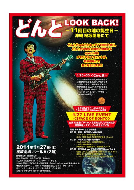 今年は沖縄で開催!今年のどんとの命日は、どんなミラクルがおきるでしょう?? 沖縄ならではの、あり得ない〜〜(!)顔合わせで 超HAPPYな新年の幕開けを! とにかく、最高に楽しい日となることでしょう!! 新たな次元に出発で〜〜す どなたもお見逃しなきよう ☆どんとLOOK BACK!☆ ー11回目の魂の誕生日ー 沖縄 桜坂劇場にて どんとがspiritとなって11回目の命日。どんとの宇宙を立体的に冒険するspecialなメモリアルイヴェントが、桜坂劇場にておこなわれます!! ☆1/25〜