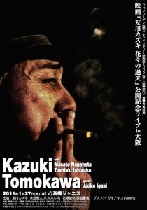 * 公演名 : 映画「友川カズキ 花々の過失」公開記念 ライブ in 大阪 ( &新作『青いアイスピック』 / 『友川カズキ歌詞集 1974-2010 ユメは日々元気に死んでゆく』 発売記念ライブ) * 出 演 : 友川カズキ (Vo,Gt ), 永畑雅人 ( Piano, Accordion, Mandolin ) ,石塚俊明 ( Drums ) * ゲスト : イガキアキコ (for たゆたう violin ) * 日 付 : 2011年1月27日 (木) * 会 場 : 心斎橋 ジャニス (大阪) http://musicclubjanus.com/ 大阪市中央区東心斎橋2-4-30-5F TEL06-6214-7255 * 時間 : 開場 19:00 / 開演 19:30 * 料金 :