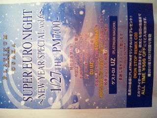 2011年スタートのイベント 今回は、9/16 Vor3のゲストDJちゃっきぃの EURO DE NIGHTで大好評のベストパートナー DJ UZが遂に登場します♪ お楽しみに!!! プラチホームページ案内 ↓ http://platinum-jp.jp/osaka/html/event.cgi?sele=&year=2011&mon=01 今回は90年ジュリテク、80年ハイエナジーと盛りだくさん!!! もちろん、ユーロビートはガンガン紹介して行きます 冬バージョンの曲も掛けますので合わ