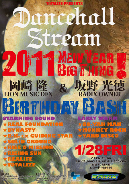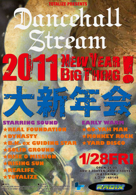 名古屋を代表するFOUNDATION SOUND TOTALIZEがオーガナイズする2011年1発目のDANCEHALL STREAMは新年会を兼ねてNEW YEAR BIG TINGを行います!そしてなんと名古