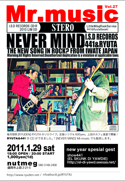 新年明けましてミスターです。 今年も音楽そのもの、ミスターミュージックに敬意を表して RYUDENのフロントマン、佐々木 龍大がお届けしている 小さくて好いイベント 「ミスターミュージック vol.27」が開催されます。 今回は岩手の盟友 [El skunk di yawdie]のフロントマン、 show 441をゲストに迎えてお贈り致します。 龍大と441のコラボレーションユニット「Little Wing Rock Service」のアルバム発売記念という事で、 お互いのソロワークと共に 二人での演奏もあると思います。 Open: 18:00 Live start 20:00 10