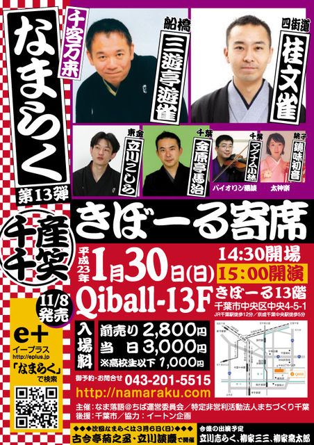 <なまらく きぼーる寄席 千産千笑> 「千葉県出身の落語による落語会」 日時:1月30日(日) 開場14:30 開演15:00 出演: 「三遊亭遊雀・桂文雀・立川こしら・金原亭馬治 マグナム小林・鏡味初音、他」 会場:「きぼーる13階 」千葉市中央区中央4−5−1 http:// www.qib all.inf o/index .php (JR千葉駅より徒歩12分、京成千葉中央駅より徒歩5分) 木戸銭:予約2800円 当日3000円 (高校生以下1000円) お申し込み イープラス(