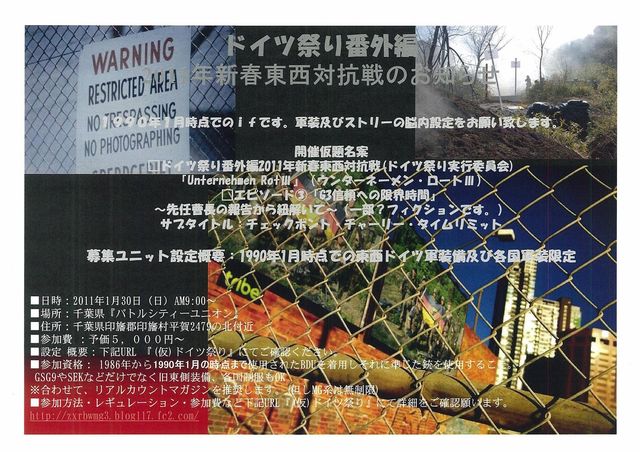 こんにちは、 ドイツ祭準備委員会広報担当のMG3です。 3回目を迎える新春東西戦開催日時が決まりましたのでお知らせいたします。 □ドイツ祭り番外編2011年新春東西対抗戦(ドイツ祭り実行委員会) 『Unternehmen Rot?』(ウンターネーメン・ロート?) □エピソー?『G3信頼への限界時間 』 〜先任曹長の報告から紐解いて〜(一部?フィクションです。) サブタイトル:『チェックポント・チャーリー・タイムリミット』 □日程&時間 2011年1月30日(日):東西戦開催 集合時間AM9:00 □場所:千葉県『バトルシティー