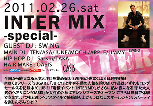 管理人様、告知失礼します。 2/26(土) INTER MIX -special-@渋谷ELF [GUEST DJ] SWING [MAIN DJ] TEN/ASA/JUNE/MOCHI/APPLE/JIMMY/and more [HIP-HOP FLOOR DJ] SASSH/TAKA/and more [HAIR MAKE BOOTH] OASIS ----------------------------------------------------------------- 【HAPPY HOUR 〜24時】 24時まで男性1000円 2ドリンク 女性無料です! 【24時以降】でもGuest申請していただければ 男性1500円1ドリンク 女性1000円2ドリンク ※この間違いないPARTYに、自分にメッセージいただければ,上記のディスカウ