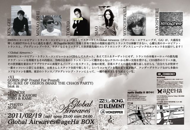 2011.02.19 (sat) Global Airwaves @ ageHa BOX 開催決定! 来たる2011年の2月19日(土)にGlobal Airwaves @ ageHa BOX開催が決定しました! メインアリーナはモンスターテクノパーティ「Clash」でゲストDJはSteve Lawler ! 前回以上に熱くなる事間違いなし! entrance:\3,500 discount:\2,000 discountゲストの登録を受付けます。 メッセージ(http://mixi.jp/show_profile.pl?id=4405646&from=navi)でご連絡ください。 ---------------------------------------------------------------------------- Global Air