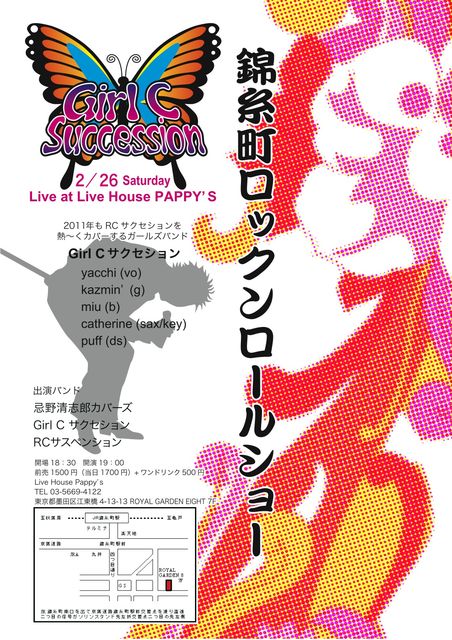 詳細決定です! 「The Day of RC サクセション 2011 winter」 2011年2月26日(土)Live House PAPPY'S http://pappys.co.jp 19:00 〜 Girl C サクセション(from 三多摩) 19:50 〜 忌野清志郎カバーズ(from 東京) 20:40 〜 RCサスペンション(from 名古屋) adv 1500円 day 1700円 1dr500円 当日お店の方にご来場者様リストを渡しますので、受付で名乗ってくださると 予約料金でご入場いただけます。 ご来場表明がまだの方はこちらに書き込んでいただくか、ご連絡くださいませ。 どうぞよろしくお願いします(^−^)/