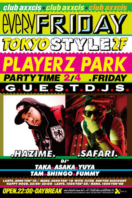 管理人様告知失礼します。 今夜、いま渋谷で最も注目されてるclub axxcisで超豪華なPARTY開催します! その名は"PLAYERZ PARK"! 毎週金曜に開催されているこのパーティー、週替わりで日本を代表するHipHopDJがプレイ。群がるPartyPeopleは1000人超! 言わずもがな、毎回フロアはテンションMAXに! 今回の2/25(金)はなんと、ゲストに日本が世界に誇る『DJ HAZIME』、そして『DJ KANGO』を迎えます!日本クラブシーンの2トップと言っても過言ではない鉄壁の布陣! 2/25、1番クールで1番盛り上がるクラブパーティーは"PLAYERZ