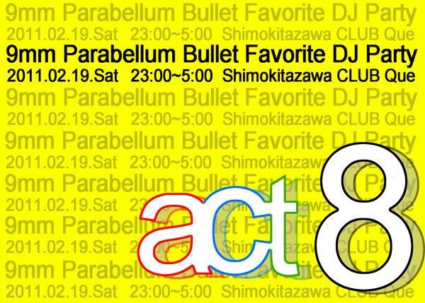 管理人様、告知失礼致しますm(_ _)m そして、9mm Parabellum Bulletコミュの皆様、いつもお世話になっております。 今回もよろしくお願いしますm(_ _)m 予約はこのトピックとメール予約にて行います。 方法は下記の告知文に載せてあります。 本文を最後までよくお読みの上(特にクローク説明&予約方法&注意事項。)、ご予約をよろしくお願いしますm(__)m ------------------------------------------------------------------------------------- 【act 8】 元祖、9mm Parabellum Bulletを特集して