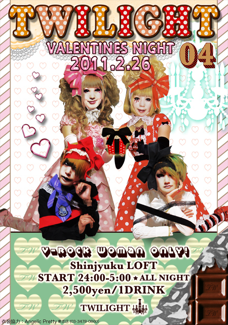 今度のTWILIGHTは、【Valentine's Day★NIGHT】! ちょっと気になるあの人、お友達になりたいあの子へアタックしたいけど、 声をかけるのはちょっと恥ずかしい…。 そんな方のお助け役として、【TWILIGHT・CUPID】が登場いたします!キューピッドが持っているメッセージカード&プチプレゼントと共に、一緒に素敵な出会いをサポート♪ Womanonly V-ROCK クラブイベント 【TWILIGHT 04】 Valentine's Day★NIGHT! 2.26(sat)→2.27(sun) All night! open 23:45 start 24:15-5:00 \2,500/1D mixi or コスプレ割引 \2,000/1D 新宿LOFT Bar