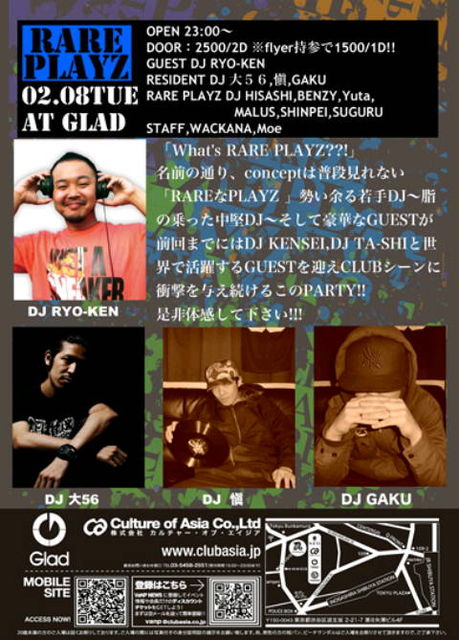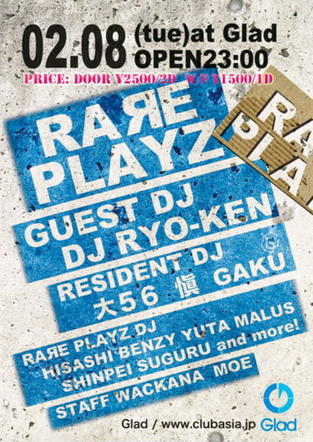 告知失礼します。 今渋谷Gladで急成長中の最注目パーティー「RARE PLAYZ」がいよいよ02/08(火)にやってきます Conceptはその名の通り他では見ることのできない「RAREなPLAY」 渋谷では滅多に聞くことのできないRAREなDJ、RAREな選曲、RAREなGrooveを体感できるのはここだけです とにかく音楽が好き! とにかく踊るのが好き! とにかく揺れるのが好き! とにかくお酒が好き! Clubの空間や空気が好き! 全てにおいて満足度100%!!!! 過去にはゲストに世界的に活躍するDJ KENSEI やDJ