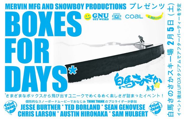 “ボックス三昧でとにかく楽しいイベント” Boxes for Days の日本開催が決定しました。日時と場所は2月5日 (土) 11am - 3pm 白馬さのさかスキー場、出場は誰でも無料です。