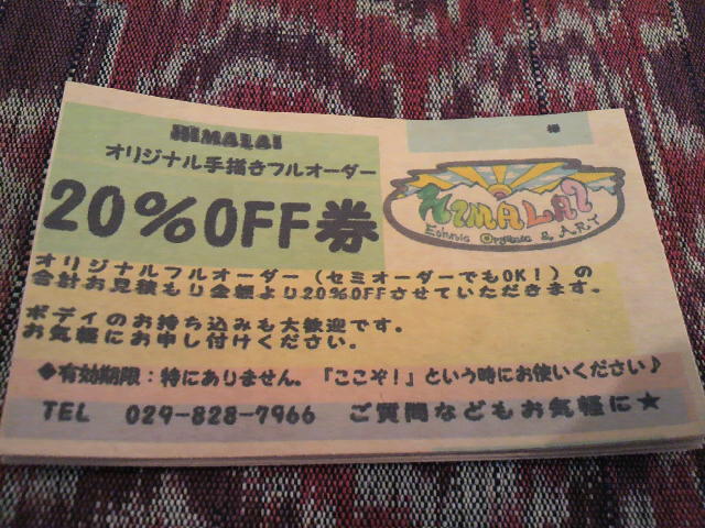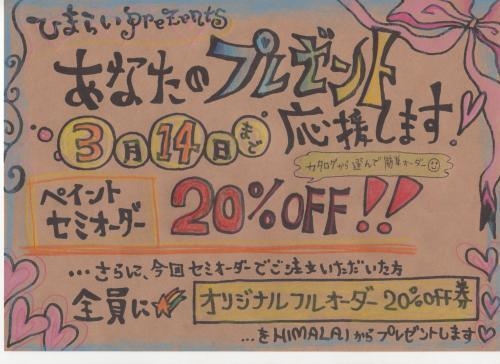 バレンタインデーやホワイトデー… プレゼントシーズンに突入しましたね〜 『今年はちょっぴり変わったものをプレゼントしたい』 『彼(彼女)をびっくりさせたい』 …なんて色んなことを考える時期なのでは そんな【あなたのプレゼント応援します!】 …と題して、ひまらい的プレゼントの提案です 店舗にあるセミオーダーカタログからデザインを選んで 簡単に注文できちゃいますよ! 今回3/14までにセミオーダーのご注文をいただいたお客様は ペイントの合計金額から20%OFFし