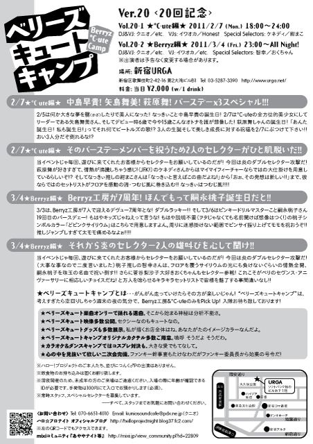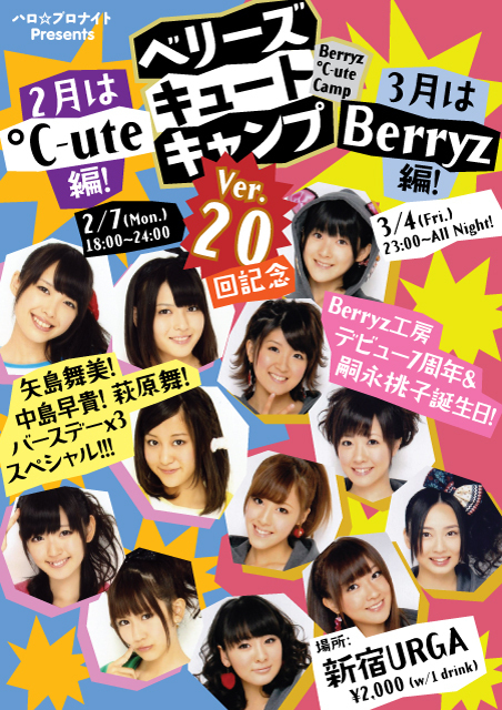 2008年1月から開催継続し遂に20回! ベリーズキュートキャンプはこの記念にはじめて、 【℃-ute編】→2月開催 【Berryz工房編】→3/4(金)23:00〜開催 と、特集を分けた開催を実現して行きたいと思います! 只今より第20回記念開催『℃-ute編』の入隊希望者を募集致します!! ★★ベリーズキュートキャンプ ver.20★★ 20回記念 ver.20-1 ★℃-ute編★ 〓〓〓〓〓〓〓〓〓〓〓〓〓〓〓〓〓〓〓〓〓〓〓〓〓〓〓〓〓〓〓〓〓〓〓〓 ※配布フライヤー裏面に「深夜開催のため未成年入場不可」とありますが、 2月7日につきましては