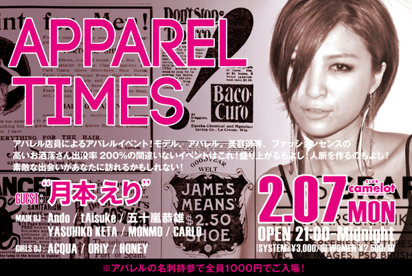 有名ショップ店員やモデルが集まるキャメロットでも客層NO1イベント アパレル業界のに興味がある方や、業界の方々の出会いや交流を深めたい方も是非参加して下さい お洒落さんいっぱい集まれ〜 前回は何と平日にして500人の人で賑わいました 今回はゲストにメディアで大活躍中のタレント、モデルの月本えりさんが登場 音楽を楽しみたい方も大歓迎 キャメロットレジデントDJのAndoをはじめ、都内などで活躍しているDJが盛り上げます ---------------------------------------------------