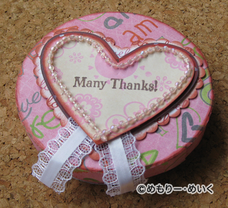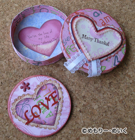 管理人様、貴重なスペースをお借りします。 すりーぱいんずひるで開催していますスクラップブッキング定期教室(2月の)お知らせです。 ボックスとボックスに入れるミニブックを作ります。 ペーパーはすでにカット済み。 写真の作品は作例になり、数種類のペーパーからパーツをお選びいただきます。 (厚紙だけは、カットの目安となる切れ目がありますので、ハサミ等で切り抜く作業があります) 手のひらサイズの小さなボックスには、ハートのモチーフがいっぱいです。 かわいさがいっぱいつまった作品で、LOVEはもちろん、感謝の心、気持ち