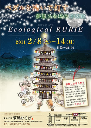 東大寺門前のイベントに協賛致します。 自転車を踏んで灯りを灯しましょう。 点灯するには多くの人たちの「脚力」が欠かせません。 ※お気軽にご参加ください! ・参加者の性別、年齢は問いません。 ・婦人用の自転車を漕げるお子様も大歓迎! http://www.yume-kaze.com/news/2011/01/test.html
