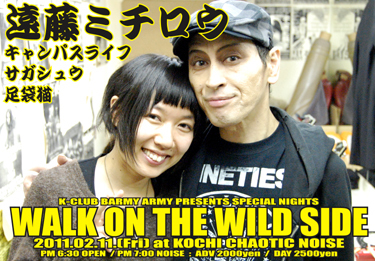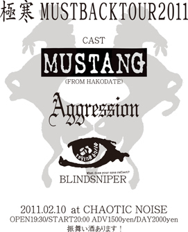 一本目2月10日(木)は、函館よりロッキンジャパニーズハードコア・MUSTANGが来高!!(開場/開演時間にご注意!!) 二本目2月11日(金/祝日)は、ジャパニーズパンクレジェンド・遠藤ミチロウが来高!! 三本目2月12日(土)は、暗黒NO WAVE軍団・BONANZAS、更にキテレツ変則ロック軍団・似非浪漫が来高!! ラスト四本目2月13日(日)は、岡山より土の匂いを放つロックバンド・ケッチ、更に神戸の若手シューゲイズ・kasuppaが来高!! 詳細はこちら(↓) ● 02月10日(木) "AGGRESSION" Presents [ 極寒MUSTBACK tour 2011 ] PM 7:30 OPEN / PM 8:00 NOIS
