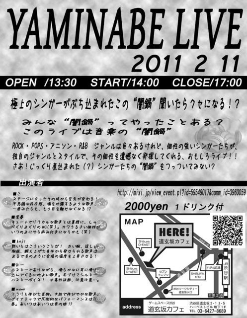 第1回“闇鍋ライブ”in 道玄坂カフェ ●極上のシンガーがぶち込まれたこの“闇鍋”聞いたらクセになる!?● みんな“闇鍋”ってやったことある? そうそう、みんなが思いおもいの食べ物を持ち寄って一つの鍋でぐつぐつ煮るアレ♪ このライブは音楽の“闇鍋”。 ROCK・POPS・アニソン・R&Bジャンルはいろいろあるけれど、個性の強いシンガーたちが、思いおもいのジャンルとスタイルで、その個性を遺憾なく発揮してくれる、そんなジャンルに縛られない個性の集まライブはまさに“闇鍋”! 聞けばきっと新しい音楽の世界を広げてくれる……と